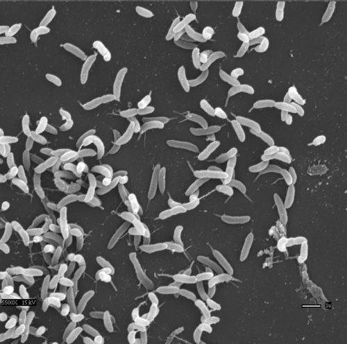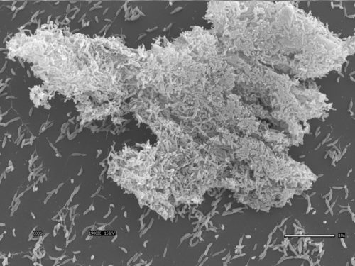 Mature biofilm of Caulobacter attached to glass coverslip viewed with scanning electron microscope, scale bar=10µm (Berne)