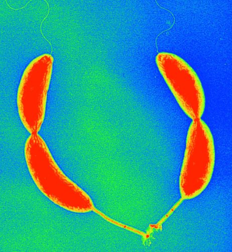 Two asymmetric predivisional cells of Caulobacter attached by their holdfasts