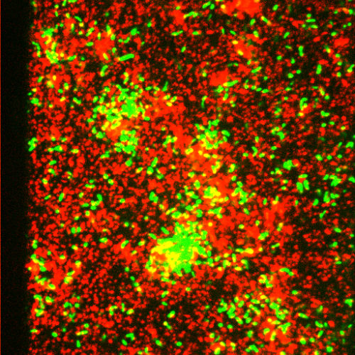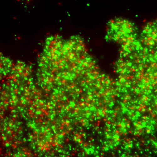 Mature Caulobacter biofilm showing live=green and dead=red cells (Berne)