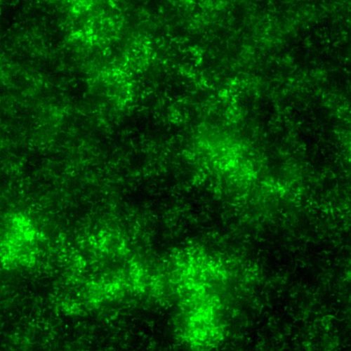 Confocal micrograph of mature Caulobacter biofilm expressing cytoplasmic green fluorescent protein (Berne)