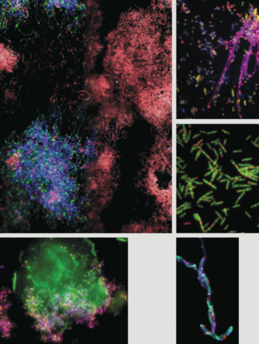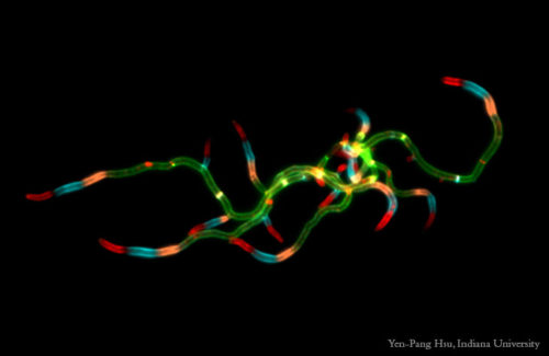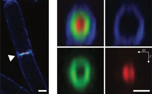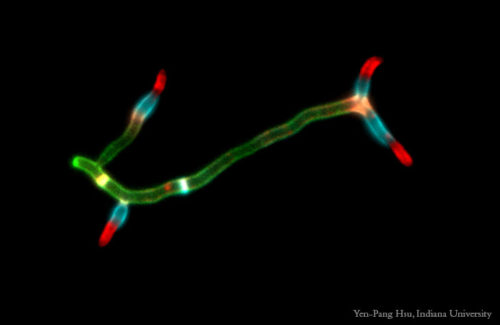 Caulobacter cells=blue, inclusion bodies=yellow, SpmX=red (Kysela)