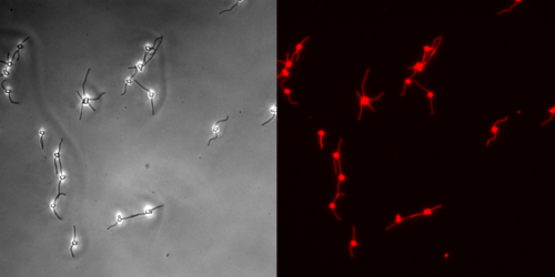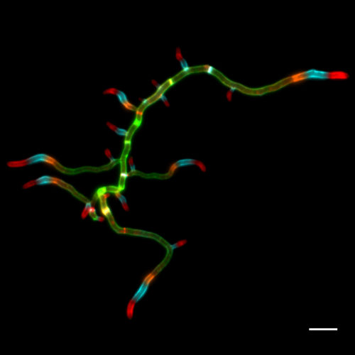 Caulobacter viewed with structural illumination super-resolution microscopy: cell wall=blue, holdfast=red (Berne)