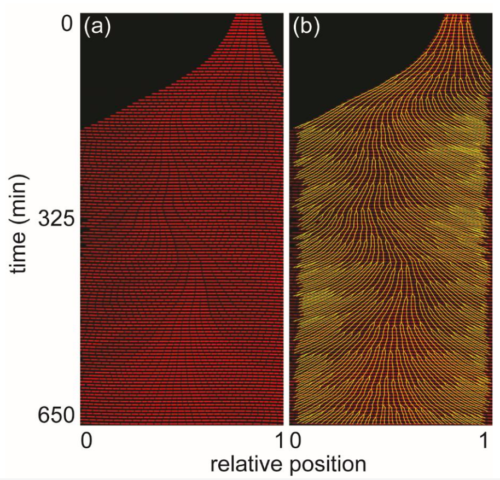 Bacillus subtilis growth in one nanochannel. Cytoplasm expressing red fluorescent mCherry, lineage tracked in yellow. (Kysela)