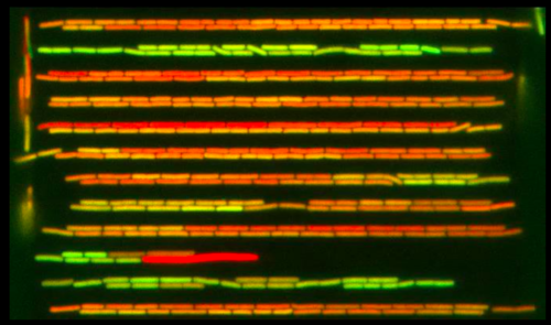 Bacillus subtilis growing in nanochannel device (cytoplasm=red, motility genes=green) (Kysela).