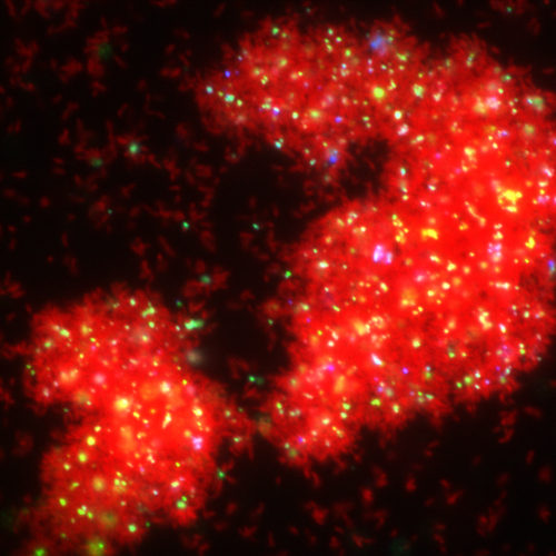 Mature Caulobacter biofilm at 72 hours of wildtype=red and pilus mutant=green (Berne)