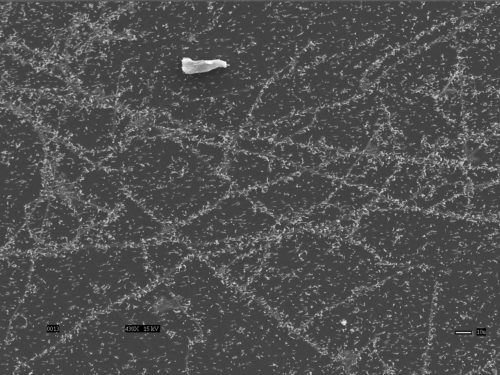Early stage biofilm of Caulobacter attached to glass coverslip viewed with scanning electron microscope, scale bar=1µm (Berne)
